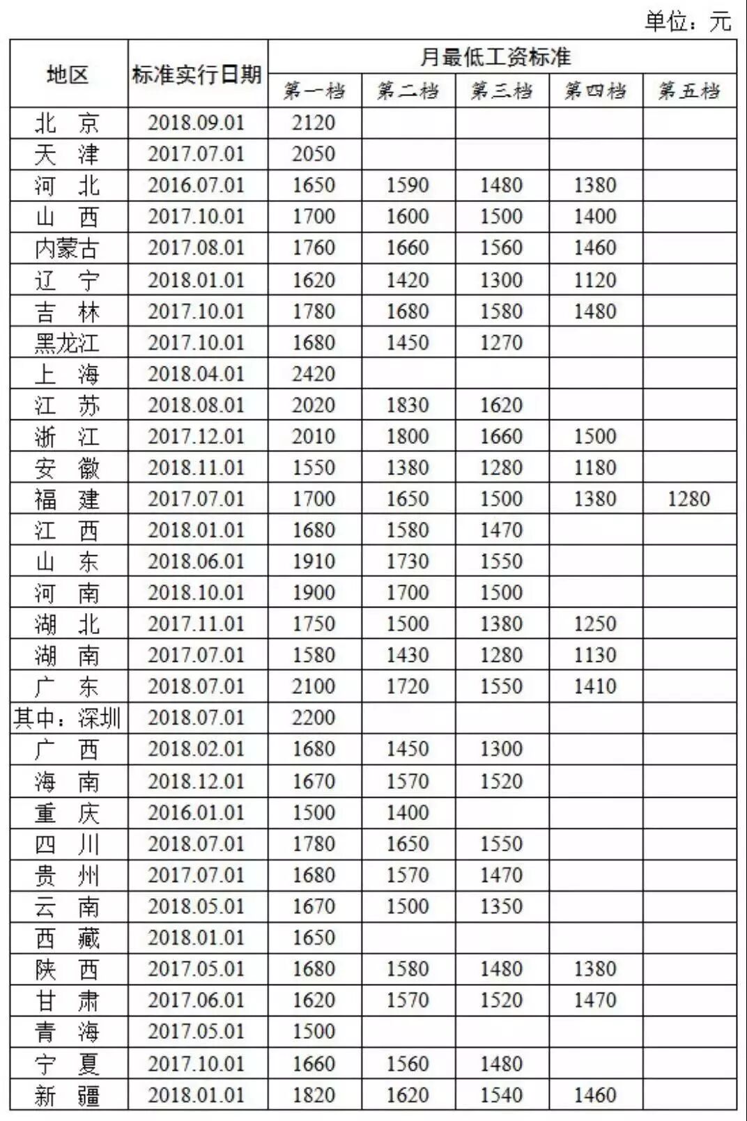 1月10日,人社部公布全国各地区月最低工资标准情况(截至2018年12月),其中,上海月最低工资标准达到2420元,为全国最高。