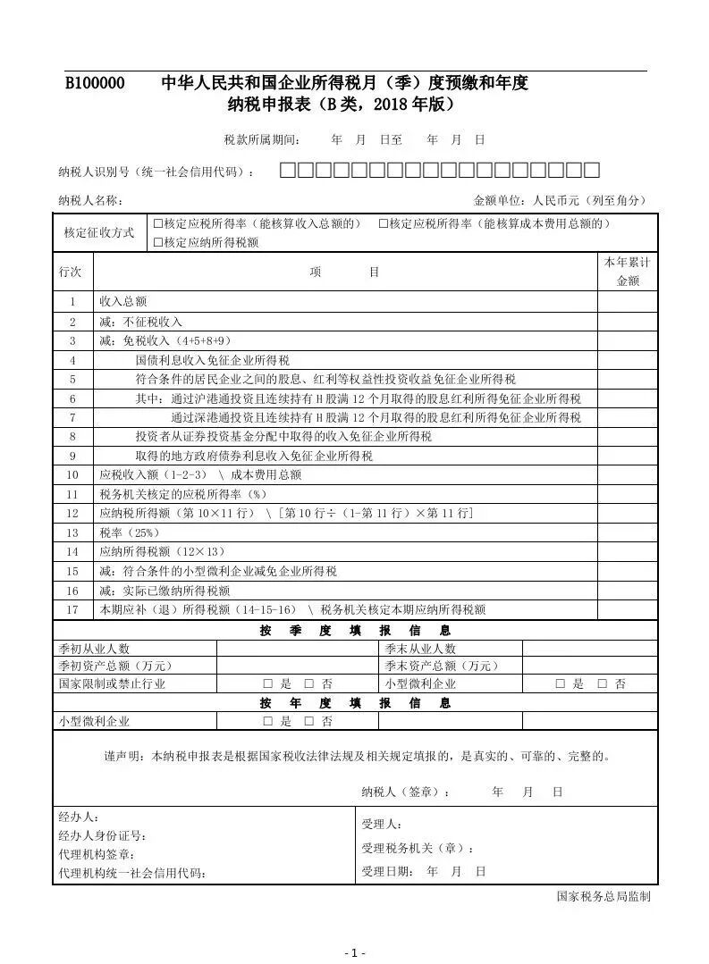 3核定征收企业注意!B100000《中华人民共和国企业所得税月(季)度预缴和年度纳税申报表(B类,2018年版)》填报说明